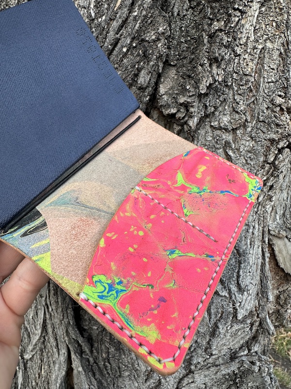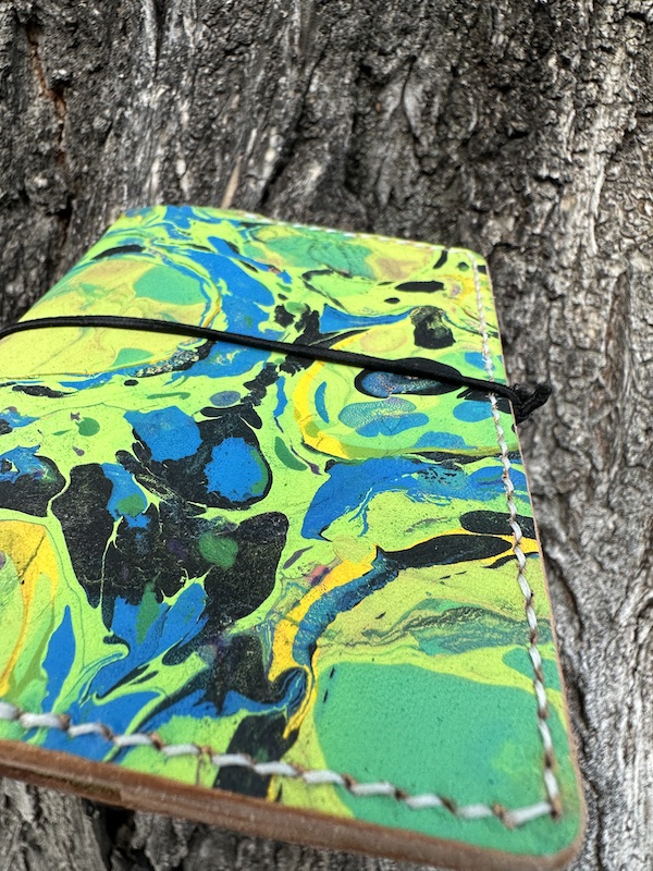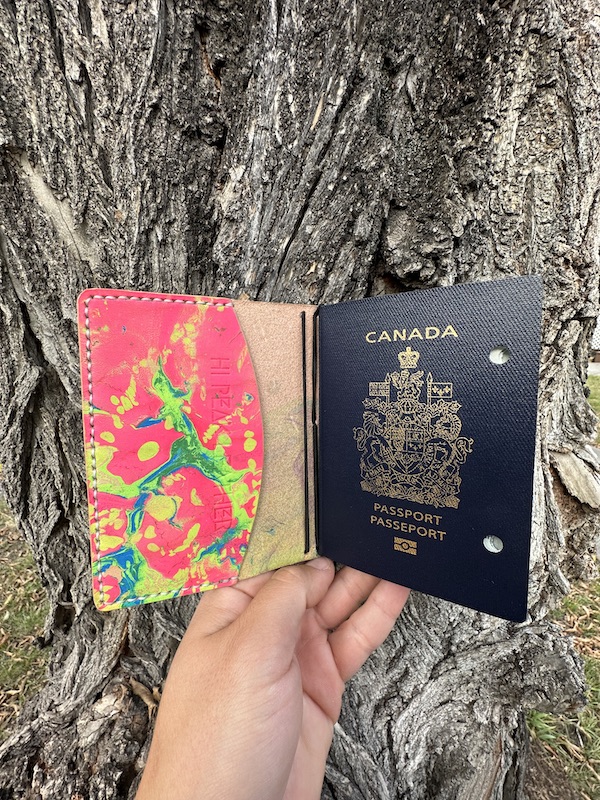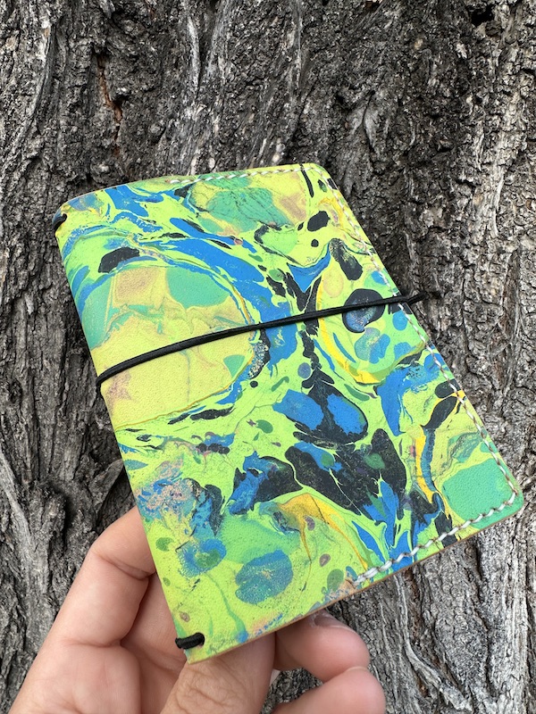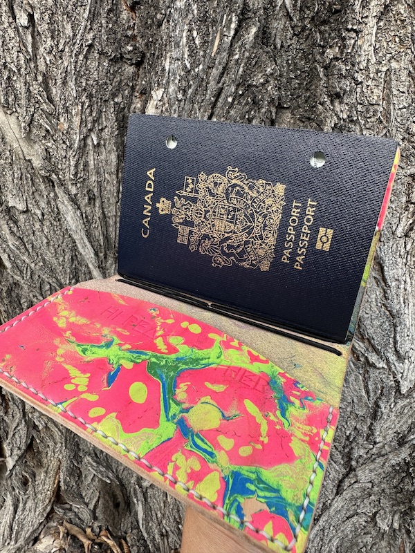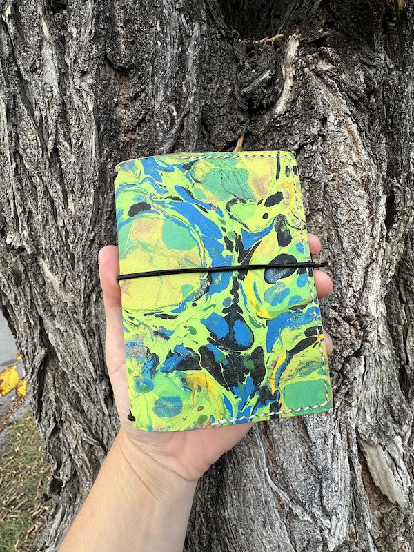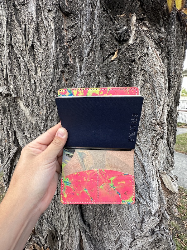This hand-marbled passport cover has one pocket on the inside, fits a regular passport nice and cozy, and has an elastic band (traveller’s journal style) that makes it easy to mark your page and pop open when needed, whilst dragging your luggage behind you through security.